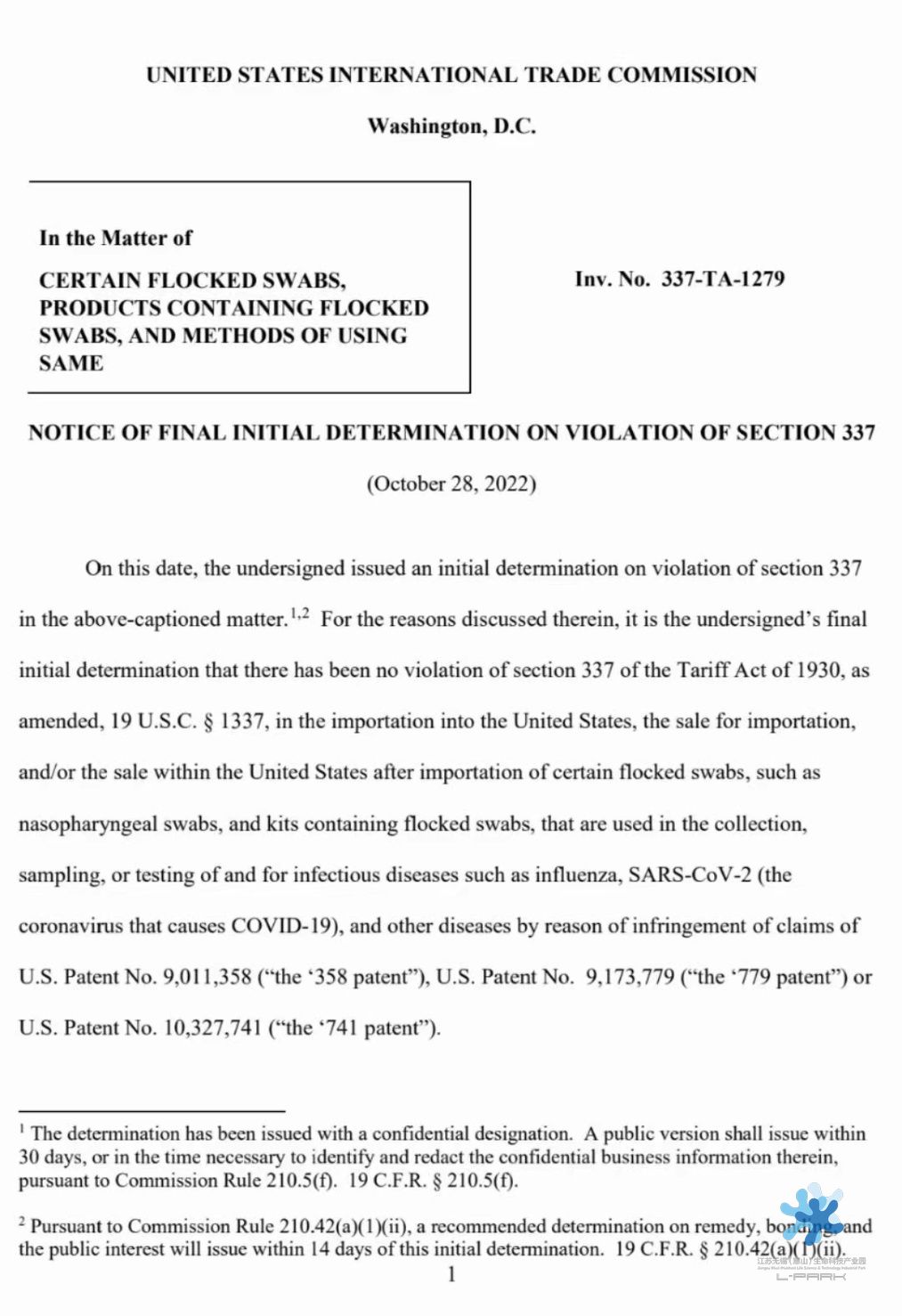 2021年7月9日,Copan根據(jù)337條款向ITC提出申請,主張對美出口、在美進口及銷售的特定植絨拭子及其下游產(chǎn)品和方法侵犯其專利權(quán),建議ITC列為指定應(yīng)訴方的中國企業(yè)共有8家,百泰克生物決定聯(lián)合其他企業(yè)積極應(yīng)訴。