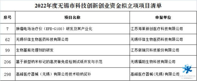 日前,無錫市科技局先后公布兩批2022年度無錫市科技創新創業資金立項項目清單。首批全市373個項目獲立項,生命園海萊新創、懷信生物、瑞貝科技、福陽生物、高峰醫療5家企業的項目入選;生物醫藥產業專項全市共48個項目入選,園區端源醫療、倍達醫療、康萊醫療、茵絡醫療4家企業的5項目獲立項。