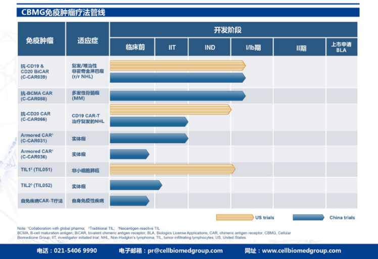 目前,CBMG臨床階段的血液腫瘤產(chǎn)品包括具有潛在同類最佳的靶向CD19/CD20新型雙靶點自體CAR-T細(xì)胞產(chǎn)品C-CAR039、靶向CD20的新型自體CAR-T細(xì)胞產(chǎn)品C-CAR066以及特異性靶向B細(xì)胞成熟抗原 (BCMA)的新型自體CAR-T細(xì)胞產(chǎn)品C-CAR088;實體瘤療法細(xì)胞治療產(chǎn)品包括自體鎧裝抗肝癌特異性抗原GPC3 CAR-T細(xì)胞產(chǎn)品C-CAR031以及腫瘤浸潤T淋巴細(xì)胞(TIL)治療產(chǎn)品C-TIL051。此外,還擁有多款新型針對血液腫瘤、實體瘤和自身免疫性疾病的臨床前細(xì)胞產(chǎn)品。