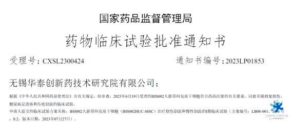 9月18日,無錫華泰創新藥技術研究院具有自主知識產權的Ⅰ類新藥——“IHS002人臍帶間充質干細胞”(受理號CXSL2300424)正式獲得國家藥品監督管理局的臨床試驗默示許可,用于修復燒傷、糖尿病足潰瘍和壓瘡創面進入I期臨床。據悉,此次IND申請獲批是無錫首張臍帶來源間充質干細胞I類新藥臨床批件,對無錫創新藥物研發進程具有里程碑式重要意義。