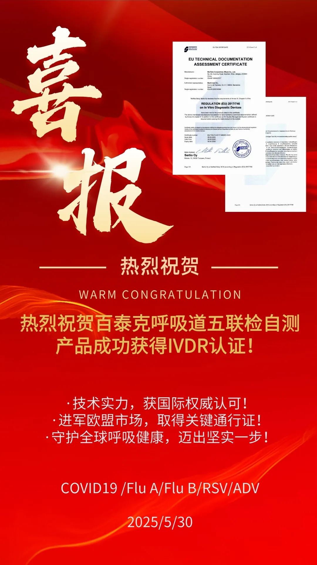 - 熱烈祝賀百泰克呼吸道五聯檢自測產品成功獲得IVDR認證